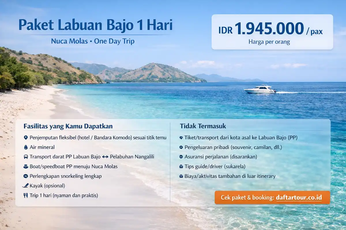 Paket Labuan Bajo 1 hari memberi solusi liburan singkat yang siap jalan untuk wisatawan yang memiliki waktu terbatas. Halaman ini membantu wisatawan yang mencari rute paling efisien, itinerary jam per jam, spot wajib kunjung, fasilitas paket, kisaran harga, dan kepastian operasional di Labuan Bajo. Wisatawan biasanya memilih trip Labuan Bajo 1 hari saat wisatawan transit, saat wisatawan menjalani business trip, atau saat wisatawan mengambil cuti mepet.